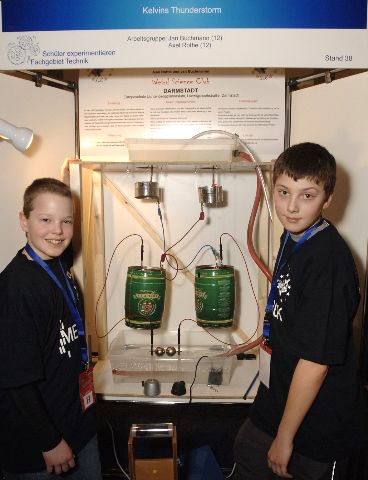 Kelvins Tropfengenerator --- Schüler Experimentieren 2006Durch eine geschickte Schaltung von Auffanggefäßen, kann mit zufällig in fallenden Wassertropfen influenzierten Ladungen Hochspannung erzeugt werden. Mehrere Modelle eines Kelvin’schen Tropfengenerators wurden gebaut und kontinuierlich technisch verbessert. Zuletzt wurde eine kontinuierlich arbeitende Version mit sehr großen Kondensatoren aufgebaut, die eine Spannung von ca. 100 000 V produziert. Das fertige Gerät kann nun im Physikunterricht eingesetzt werden. Jan Buchmann und Axel Rothe letzte Änderung: 07.01.2010 |