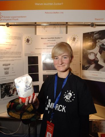 Die Tribolumineszenz von Zucker --- Jugend Forscht 2006In Amerika gibt es mit Methylsalicylat (oil of wintergreen) aromatisierte Bonbons. Wenn man solch ein Bonbon vor dem Spiegel im Dunkeln zerbeißt, sieht man ein blaues Leuchten: Tribolumineszenz. Das Leuchten von reinem Zucker ist kaum sichtbar. Wenn man eine größere Menge Zucker in einer elektrischen Kaffeemühle zerkleinert, erhält man genügend Licht, um durch ein Gitter ein Emissionsspektrum aufzunehmen. Auf diese Weise wurden Zucker-Spektren aufgenommen und mit Spektren angeregter Plasmen verglichen. Die Tribolumineszenz kann als Mikroplasma interpretiert werden in dem Stickstoffmoleküle lumineszieren. Rebecca Steffen letzte Änderung: 07.01.2010 |