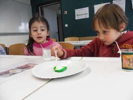 Die „Schulgeister“, wie sich die Gruppe aus 20 Schulanfängern selbst nennt, führten unter Anleitung von Frau Jost und Frau Otto Versuche im Bereich Physik und Chemie durch.